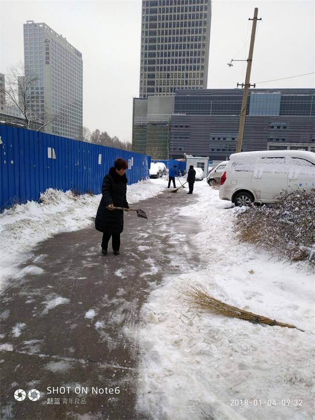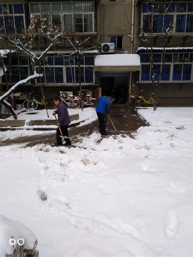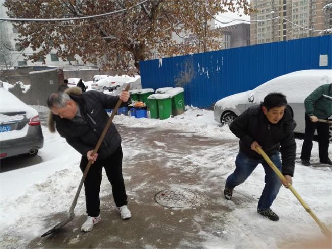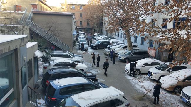 1月4日一大早,后勤保障部,兵分三路分別對南區家屬院、北區家屬和院建國路辦公區的積雪進行清掃,大家利用鐵鍬、掃帚等工具將積雪鏟走,清理出道路,在積雪較厚的地方撒除雪劑。在大家的帶動下我院退休職工李克銀、高賢峰、李君、婁季功,職工家屬李赟、賈愛榮等也紛紛加入掃雪隊伍。盡管天氣寒冷,但大家團結協作,干勁十足,經過3個多小時的共同努力,家屬區路面上的積雪、碎冰已被清掃干凈,道路暢通無阻,來往職工家屬紛紛稱贊,并表示感謝。