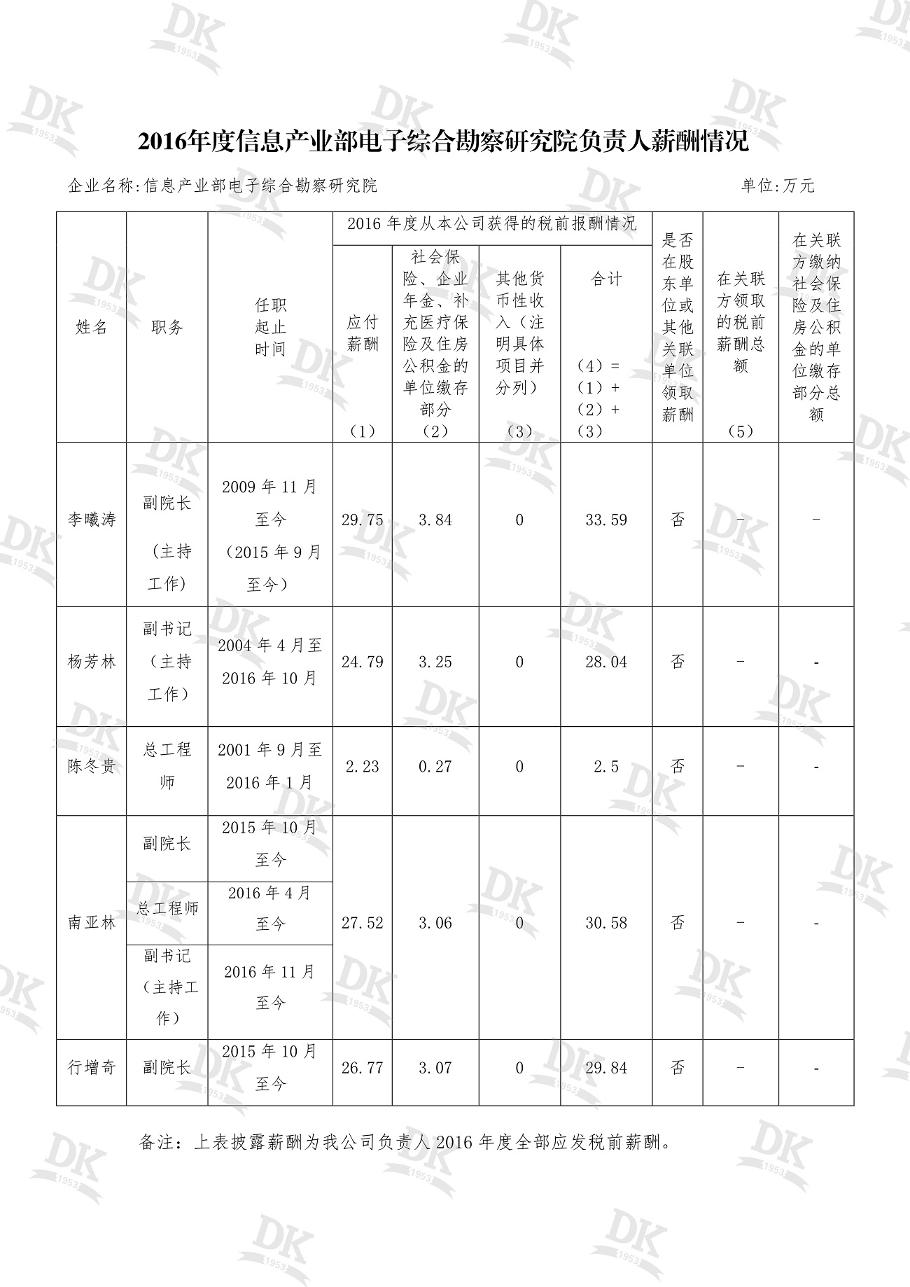 信息產業部電子綜合勘察研究院 2016年度、2017年度企業負責人薪酬 信息情況公示