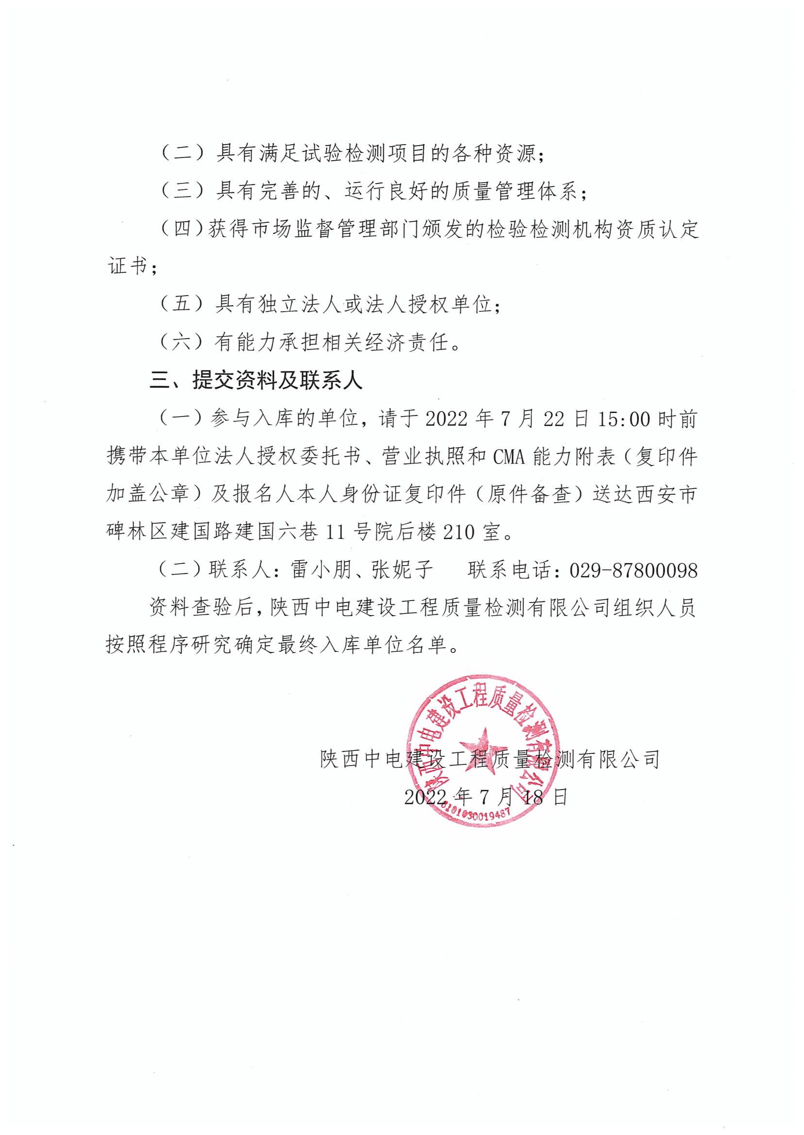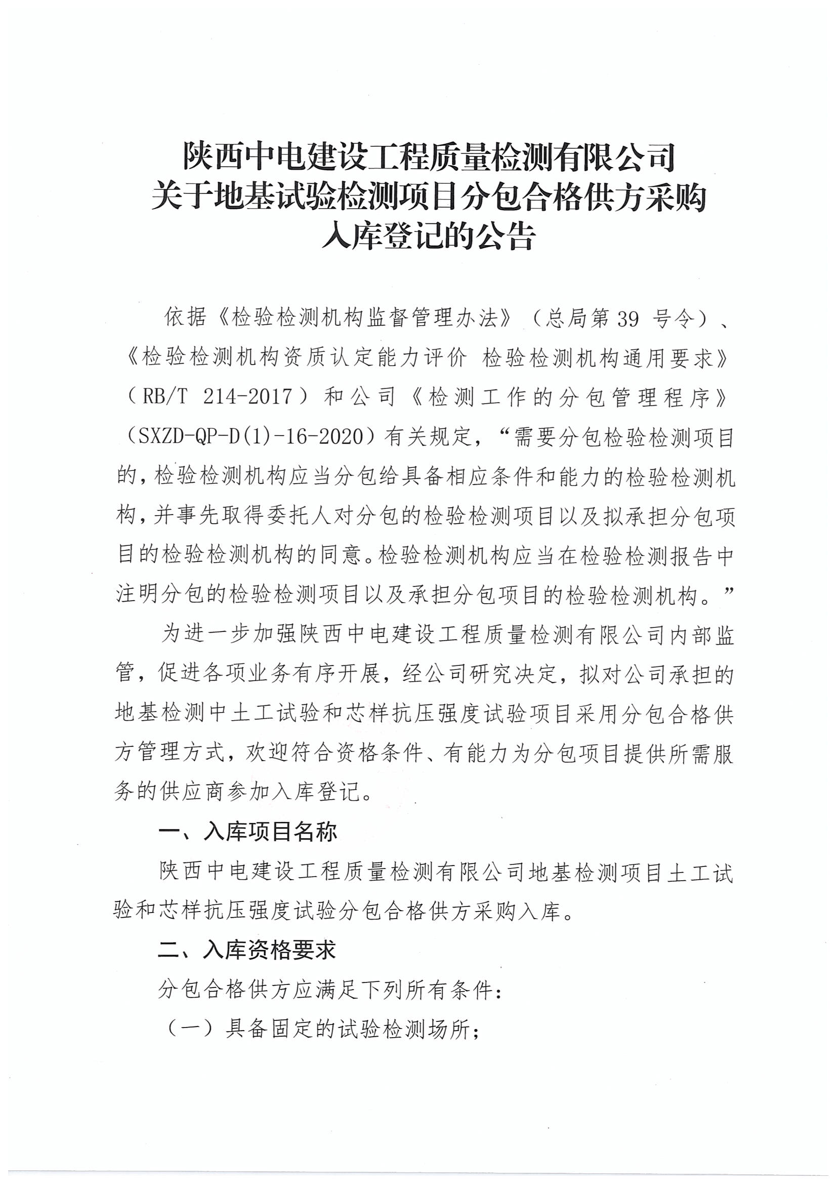 陜西中電建設工程質量檢測有限公司關于地基試驗檢測項目分包合格供方采購入庫登記的公告